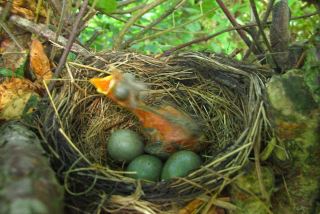 Verder weinig echt opmerkelijke zaken bij de vangsten, gewoon lekker doorwerkend veel vogels in handen gehad, bestaande uit de bekende te verwachten soorten met onder andere een mooi uitgekleurde man keine barmsijs die een ring droeg uit Augustus 2012 en nu voor het eerst weer werd teruggevangen. Verder een heggenmus uit 2011 die in 2012 nog wel enkele malen werd teruggevangen, maar vorig jaar een bezoek aan ons achterwege liet. Zo zie je maar weer, als we niet vele jaren achtereen doorvangen hadden we maar zo kunnen concluderen dat'ie wel niet meer in leven zou zijn. In één van de avondrondes vingen we twee zanglijsters waarvan er eentje door zijn gekrijs een merel naast het net op een nestindicerende manier deed reageren. Slechts twee stappen opzij in de vegetatie waren genoeg om het nest in een berkenknot te vinden met daarin één klein jong en drie eieren die nog niet waren uitgekomen.