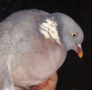 Eind van de middag hing er een Houtduif in het lange grofmazige net van sectie 6. Het was zo'n groot bakbeest dat z'n vleugellengte met 268 mm aan de max zat van de tabel in de determinatiegids van Demongin en de vleugellengte ook niet kon worden ingevoerd in onze database. Ook de weegschaal wist even niet wat hem overkwam, de teller kwam tot rust op de 585,7 gram...