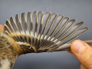 De vangdag kende dus een stroeve start, maar vanaf het moment dat de zon de netten had gedroogd, en een deel van de netten in de schaduw kwam te staan, begonnen we vogels te vangen. Dit waren grotendeels lijsters in de vorm van Merels, Zanglijsters en Koperwieken - het bekende palet.